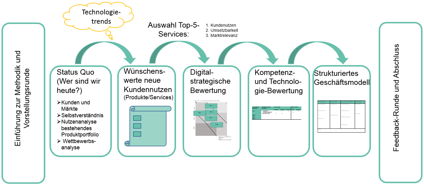- Im kreativen Teil des Workshops werden Nutzeneigenschaften zu neuartigen Produkterweiterungen oder Dienstleistungen gesammelt –> neue Geschäftsmodellideen
