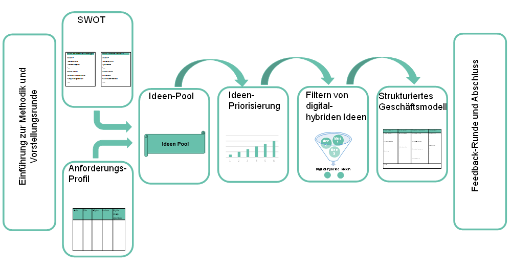 - Ideen werden gemeinsam erarbeitet und priorisiert und anschließend in ein Geschäftsmodell-Canvas übertragen